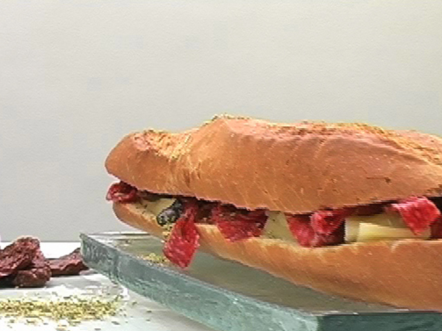 Большой бутерброд для утоления огромного голода. Состав:Багет — 1 штука;салями — 5 кусочков;сыр — 100 гр;несколько сушеных помидо;небольшое количество оливок;перец, соль, оливковое масло, орегано — по вкусу.