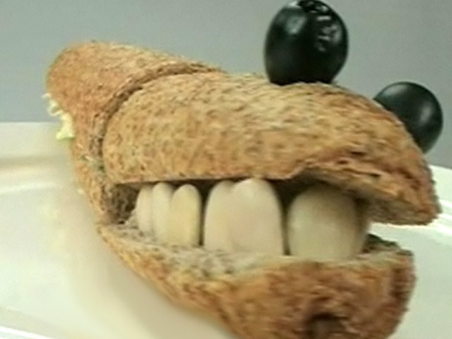 Рецепт вкусного бутерброда с ветчиной и сыром.Состав:сыр — 5 кусочков;ветчина — 5 кусочков;батон, салат, миндаль, оливки, майонез.