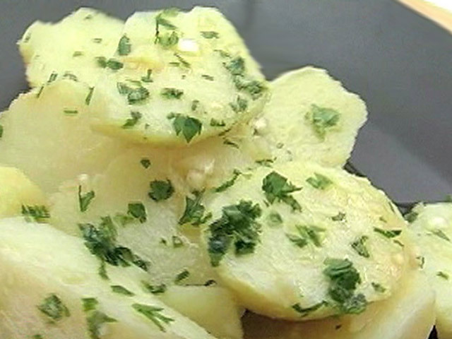 Простой и вкусный гарнир из картофеля.Состав:картофель — 5 клубней;лук — 2 штуки;петрушка;белый перец, оливковое масло, уксус хереса, морская соль.