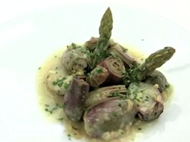 Рецепт приготовления артишоков с зеленой спаржей.Состав:артишоки — 5 штук;спаржа — 3 стебля;белое вино — 1/4 стакана;лимон — 1/2 штуки;вода — 1/2 стакана;мука — 1,5 чайной ложки;чеснок — 1 зубчик;лимонный сок, перец, оливковое масло, соль.