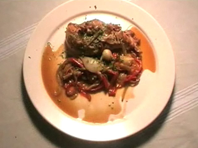 Рецепт запеченной курицы с перцем.Состав:грудка — 1 штука;перцы — 2 штуки;черри — 7 штук;лук — 1 штука;красное вино, соль, масло, уксус, бульон, петрушка, бекон, панировочные сухари.
