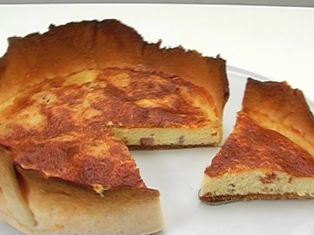Открытый пирог с основой из песочного теста и сырной начинкой.Состав:сыр — 1 чашка;бекон — 1 чашка;ветчина — 1 чашка;сливки — 1 стакан;яйца — 4 штуки;мука — 2 столовых ложки;порция песочного теста;соль — по вкусу.