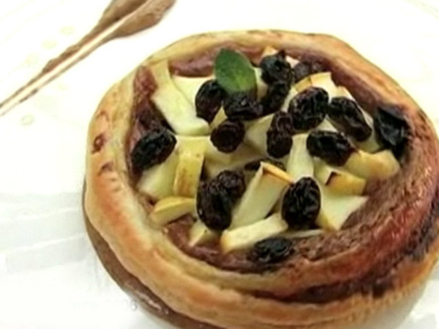 Рецепт вкусного и легкого десерта.Состав:яблоко — 1/2 штуки;изюм — 90 гр;бренди — 30 гр;мед — 1 столовая ложка;сливки — 100 гр;слоеное тесто — 30 гр.