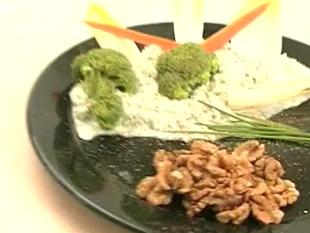 Рецепт овощной закуски с сырным соусом.Состав: сыр, укроп, чеснок, грецкие орехи, сливки, перец, соль, эндивий, сельдерей, брокколи, морковь, мускатный орех.