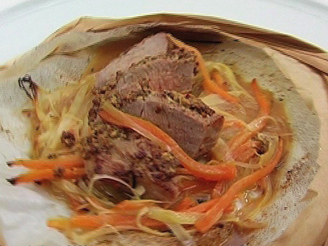Горячие блюдо из парной телятины.Состав:телятина — 150 гр;морковь — 1/2 штуки;лук порей — 1/2 штуки;сладкое вино — 2 столовых ложки;горчица Дижон, горчица зернистая — по 1 чайной ложки;масло — 20 гр;соль по вкусу.