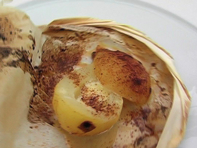 Десерт из груши с крем-фрешем.Состав:груши — 2 штуки;апельсиновый сок — 4 столовых ложки;крем-фреш — 2 столовых ложки;белый и коричневый сахар, корица — по вкусу.