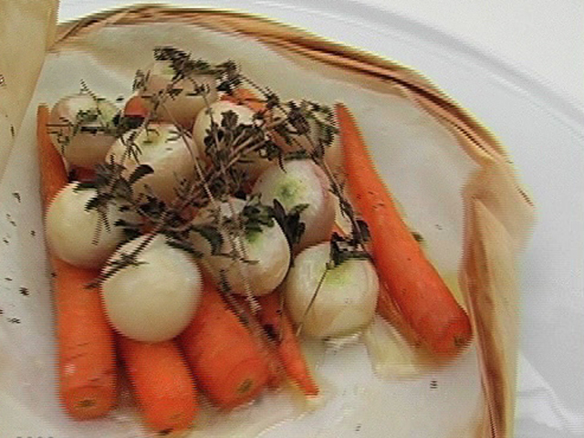 Вегетерианская горячая закуска из моркови с турнепсом.Состав:турнепс — 7 штук;морковь — 7 штук;немного тимьяна, орегано;оливковое и сливочное масло, соль, смесь перцев — по вкусу.