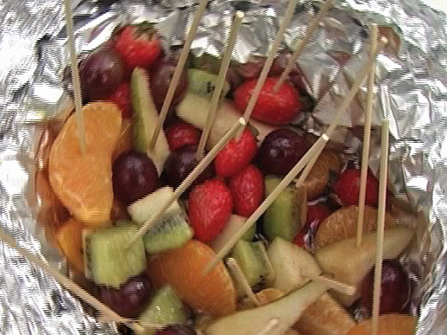 Фруктовый пикник в жаркий день.Состав:тросниковый сахар — 50 гр;клубника — 12 ягод;киви — 1 штука;мандарин — 1 штука;мандариновое масло — 3 столовых ложки;сухой имбирь — 1/2 столовой ложки;груши — 1/2 штуки;виноград — 12 ягод.