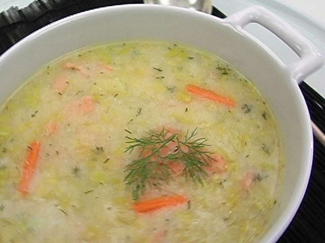 Сытный обед на всю семью с супом из картофеля и лососем.Состав:овощной бульон — 400 гр;картофель — 2 штуки;лук порей — 1 стебель;молоко — 200 гр;лимонный сок — 20 гр;лосось — 100 гр;масло, фенхель, соль, перец — по вкусу.