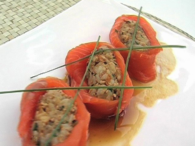 Специальные суши с лосовем и угрем.Состав:угорь — 30 гр;лосось — 50 гр;сокполовинки лимона;зеленый лук — 1 чайная ложка;кунжут — 1 чайная ложка;рис — 80 гр;соевый соус, васаби, черный перец — по вкусу.