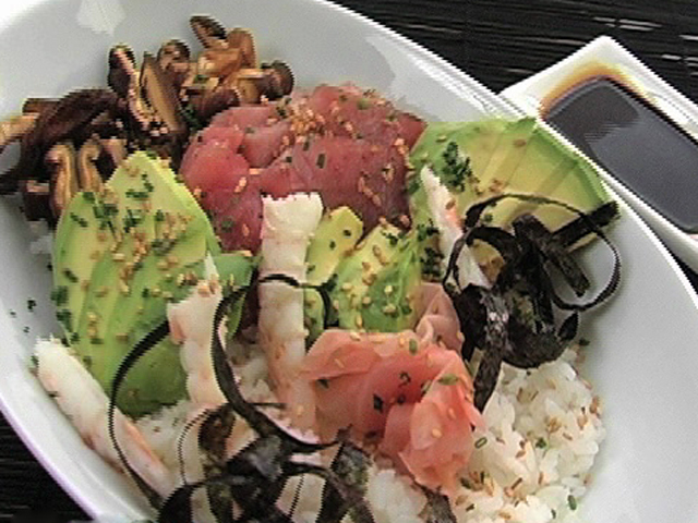 Блюдо, в котором морепродукты и овощи приготовлены и разложены на рисе для суши.Состав:тунец — 50 гр;креветки — 4 штуки;нори — 1 лист;рис — 100 гр;шитаке — 4 штуки;авокадо — 1/2 штуки;кунжут, зеленый лук, гари — по вкусу.