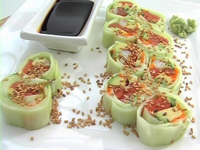 Каппа-маки используются для освежения вкуса.Состав:огурец — 2 штуки;авокадо — 1/4 штуки;тобико — 20 гр;сливочный сыр — 1 столовая ложка;кунжут — 20 гр;лосось — 60 гр;креветки — 2 штуки.